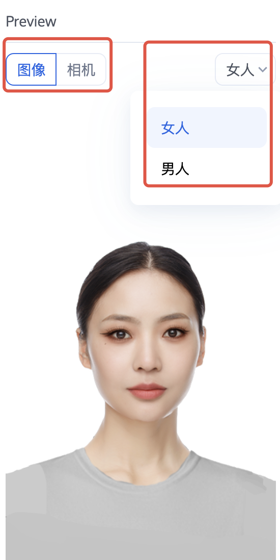 右侧的预览窗口可以预览素材叠加内置模特人脸的效果,也可以切换为电脑摄像头,查看自身面部效果。