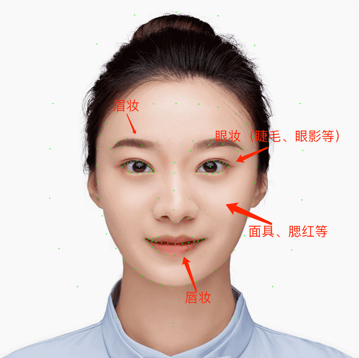 美妆功能指设计师根据标准的参照模特 PSD 模板,将制作好的 PNG 妆容素材上传至控制台,从而实现全脸妆容美化效果。