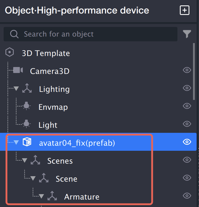 4. 对象面板上会展示出这个模型的树形结构。这个树形结构里会拥有各种类型的节点:mesh、骨骼关节等。