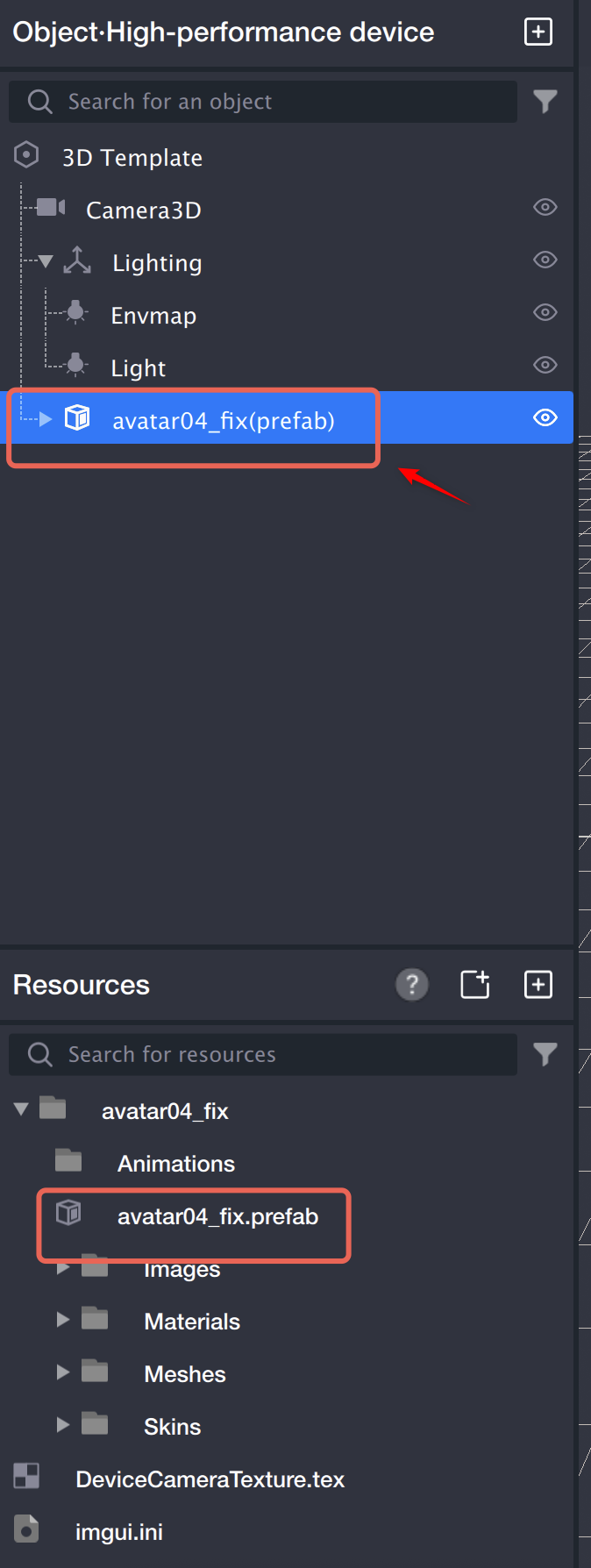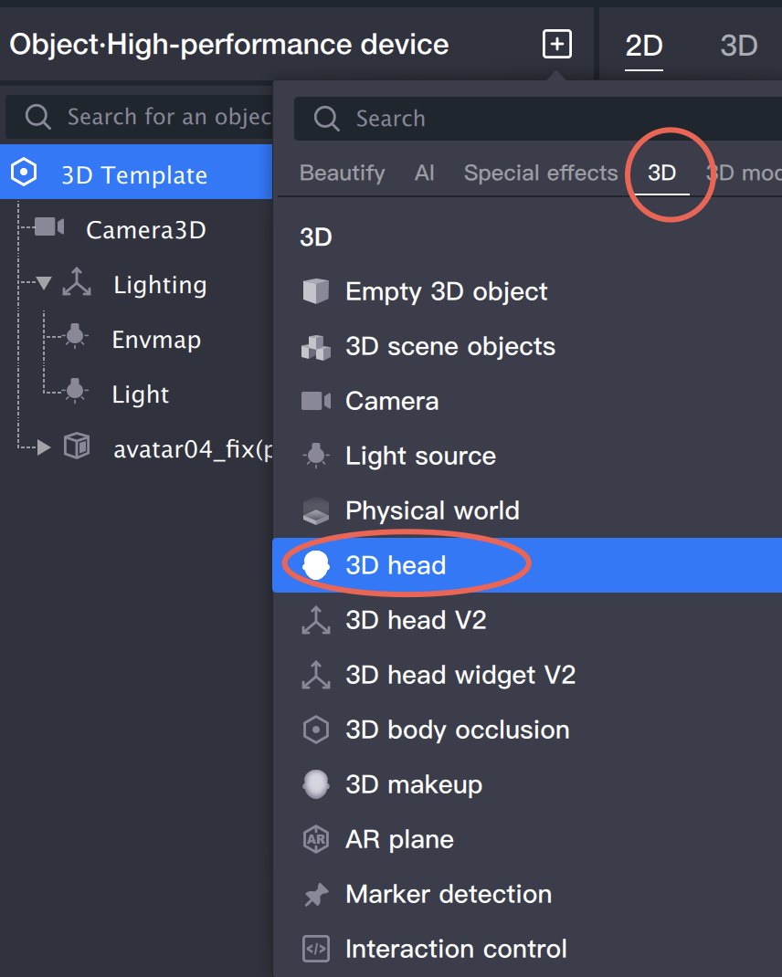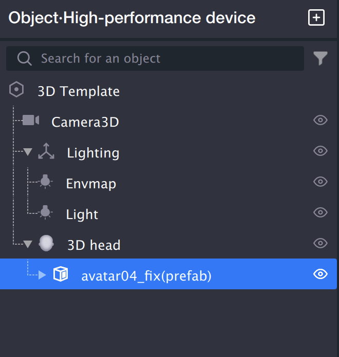 1. 在对象面板点击右键,选择新建 > 3D 人头,新建一个 3D 人头对象,将 prefab 文件拖到 3D 人头的子级。