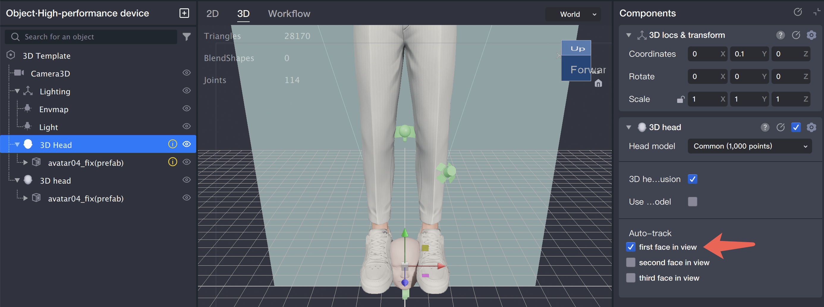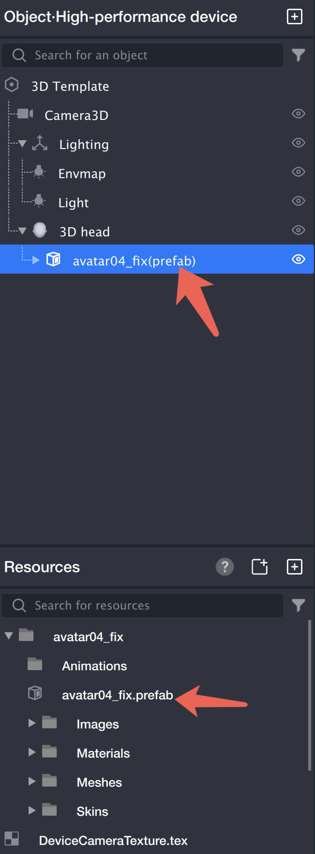 通过菜单栏 GameObject > 特效 > 3D 人头,或在层级面板右键创建 “3D 人头” 对象来添加 3D 人头对象,然后将模型导入资源面板中,将生成文件夹中的 prefab 文件拖到 3D 人头对象的子级中。