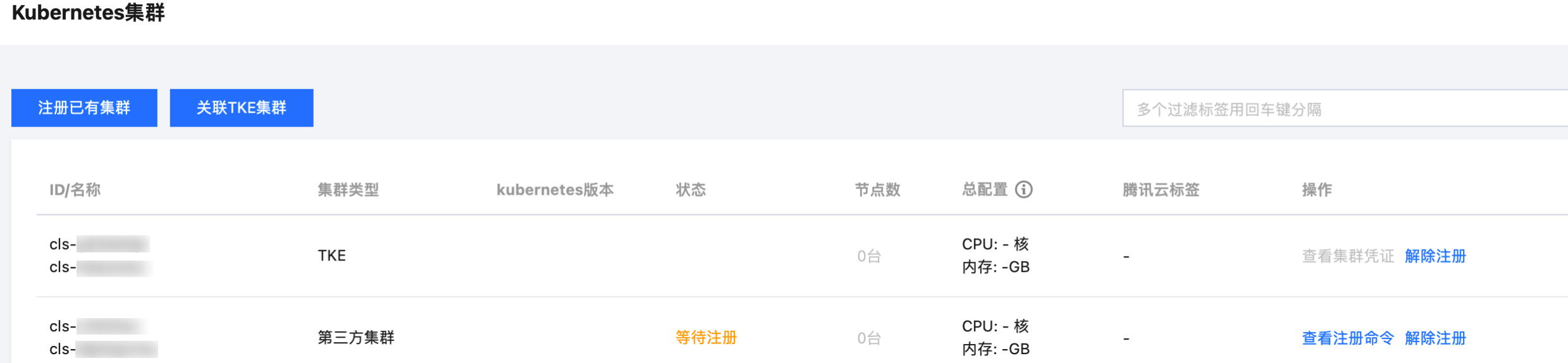 操作:该注册集群支持的操作,包括查看待注册集群注册命令,查看已注册集群凭证,解除已注册集群绑定等。