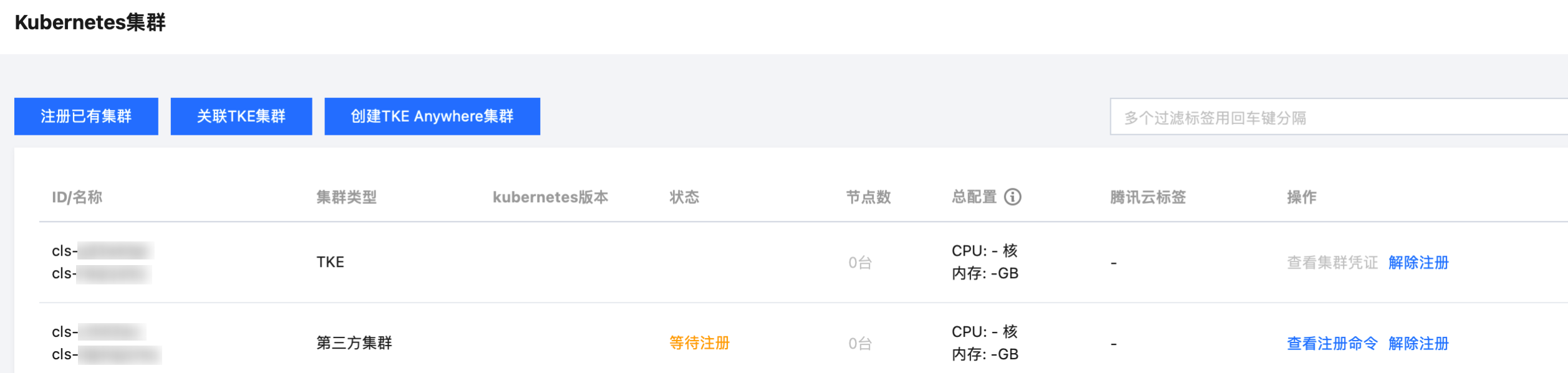 操作:该注册集群支持的操作,包括查看待注册集群注册命令,查看已注册集群凭证,解除已注册集群绑定等。