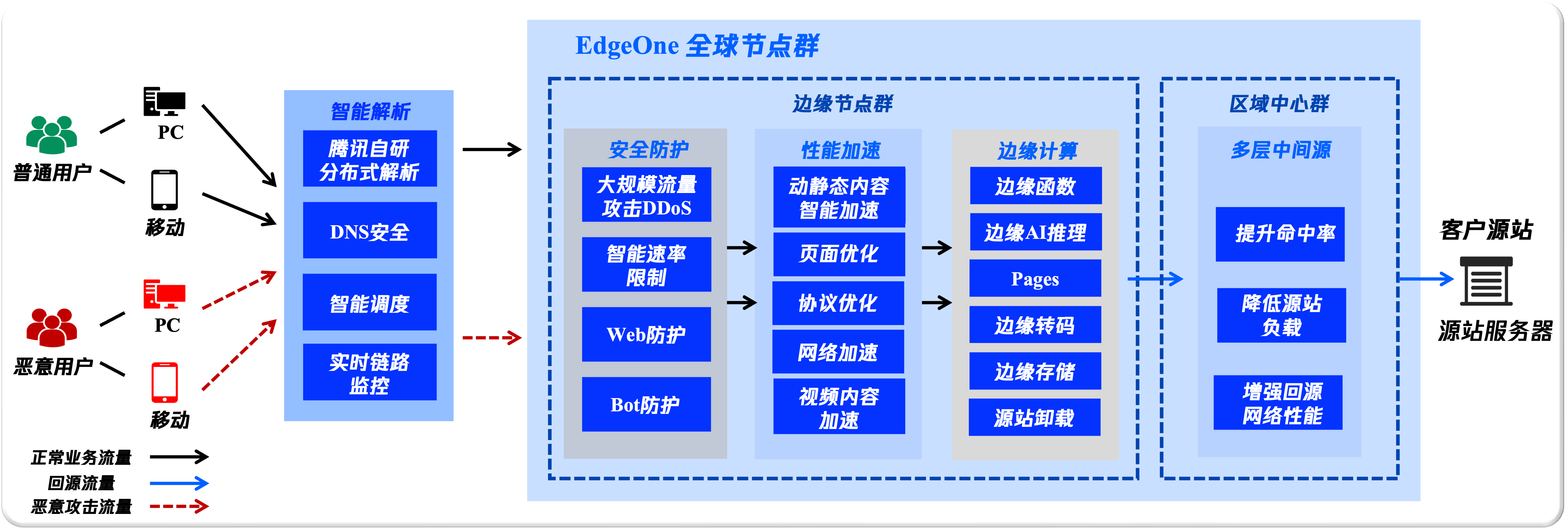 EdgeOne 主要为用户提供 DDoS 防护、 CC 攻击防护、Web 防护、Bot 管理、CDN 静态内容加速、动静态混合智能加速、边缘函数、四层代理、DNS 解析等丰富能力。产品架构如下图所示:
