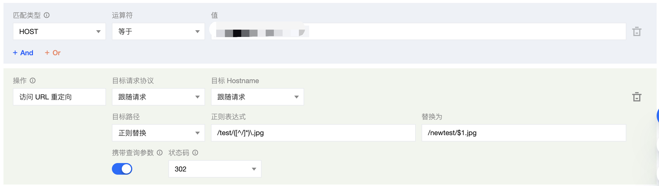 目标 Hostname | 目标重定向地址的 Hostname 部分,默认跟随请求域名,支持修改为自定义域名。例如:www.example.com。 |