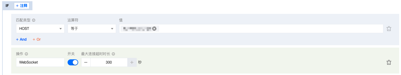 5. 单击操作 > 选择框,在弹出的操作列表内,选择操作为 WebSocket,单击开关开启,并配置最大连接超时时长。