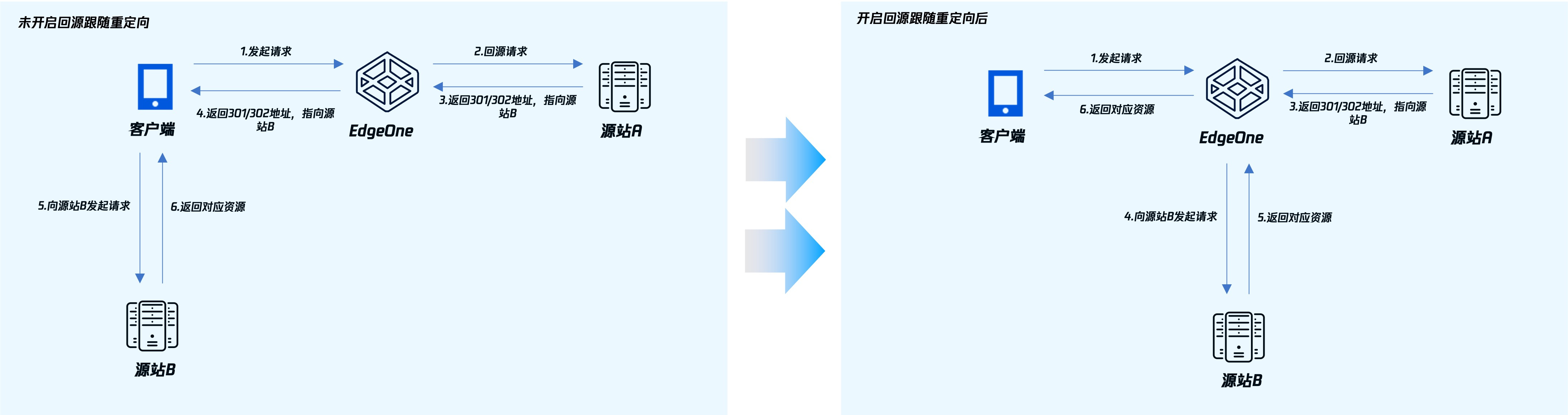 EdgeOne 支持回源跟随重定向,开启后,节点回源时如收到 301/302 状态码,会主动跟随重定向(不超过设置的最大重定向次数)至指定的地址,直到获取对应文件后,再响应客户端实际资源,能够提高用户的访问响应速度。