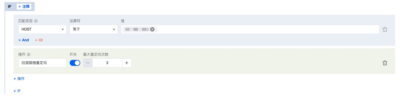 5. 单击操作,在弹出的操作列表内,选择操作为回源跟随重定向。