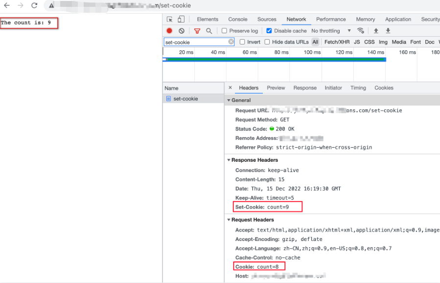 // cookie 名称const COOKIE_NAME = 'count';async function handleRequest(request) {// 获取当前请求的 Cookies,并解析为对象const cookies = new Cookies(request.headers.get('cookie'));const cookieCount = cookies.get(COOKIE_NAME);// 计数累加const count = Number(cookieCount && cookieCount.value || 0) + 1;// 更新 cookie 的计数cookies.set(COOKIE_NAME, String(count));const response = new Response(`The count is: ${count}`);// 设置响应 cookiesresponse.headers.set('Set-Cookie', getSetCookie(cookies.get(COOKIE_NAME)));return response;}// 拼接 Set-Cookiefunction getSetCookie(cookie) {const cookieArr = [`${encodeURIComponent(cookie.name)}=${encodeURIComponent(cookie.value)}`,];const key2name = {expires: 'Expires',max_age: 'Max-Age',domain: 'Domain',path: 'Path',secure: 'Secure',httponly: 'HttpOnly',samesite: 'SameSite',};Object.keys(key2name).forEach(key => {if (cookie[key]) {cookieArr.push(`${key2name[key]}=${cookie[key]}`);}});return cookieArr.join('; ');}addEventListener('fetch', (event) => {event.respondWith(handleRequest(event.request));});