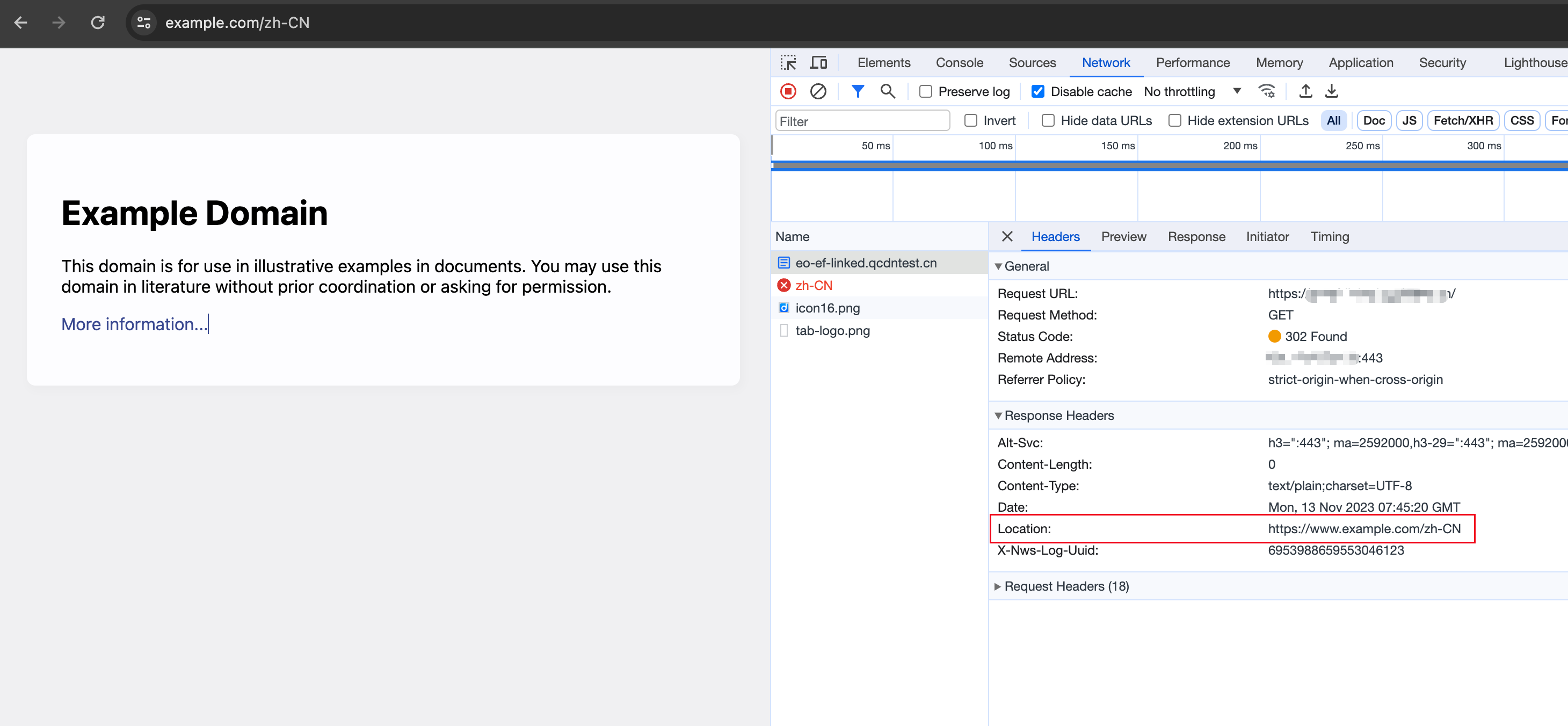 // 所有区域网址集const urls = {CN: 'https://www.example.com/zh-CN',US: 'https://www.example.com/en-US',};// 默认重定向网址const defaultUrl = 'https://www.example.com/en-US';/*** 根据当前请求所在的区域,重定向到目标网址* @param { Request } request*/function handleRequest(request) {// 获取当前请求所在区域const alpha2code = request.eo.geo.countryCodeAlpha2;// 重定向目标网址const url = urls[alpha2code] || defaultUrl;return Response.redirect(url, 302);}addEventListener('fetch', event => {event.respondWith(handleRequest(event.request));});