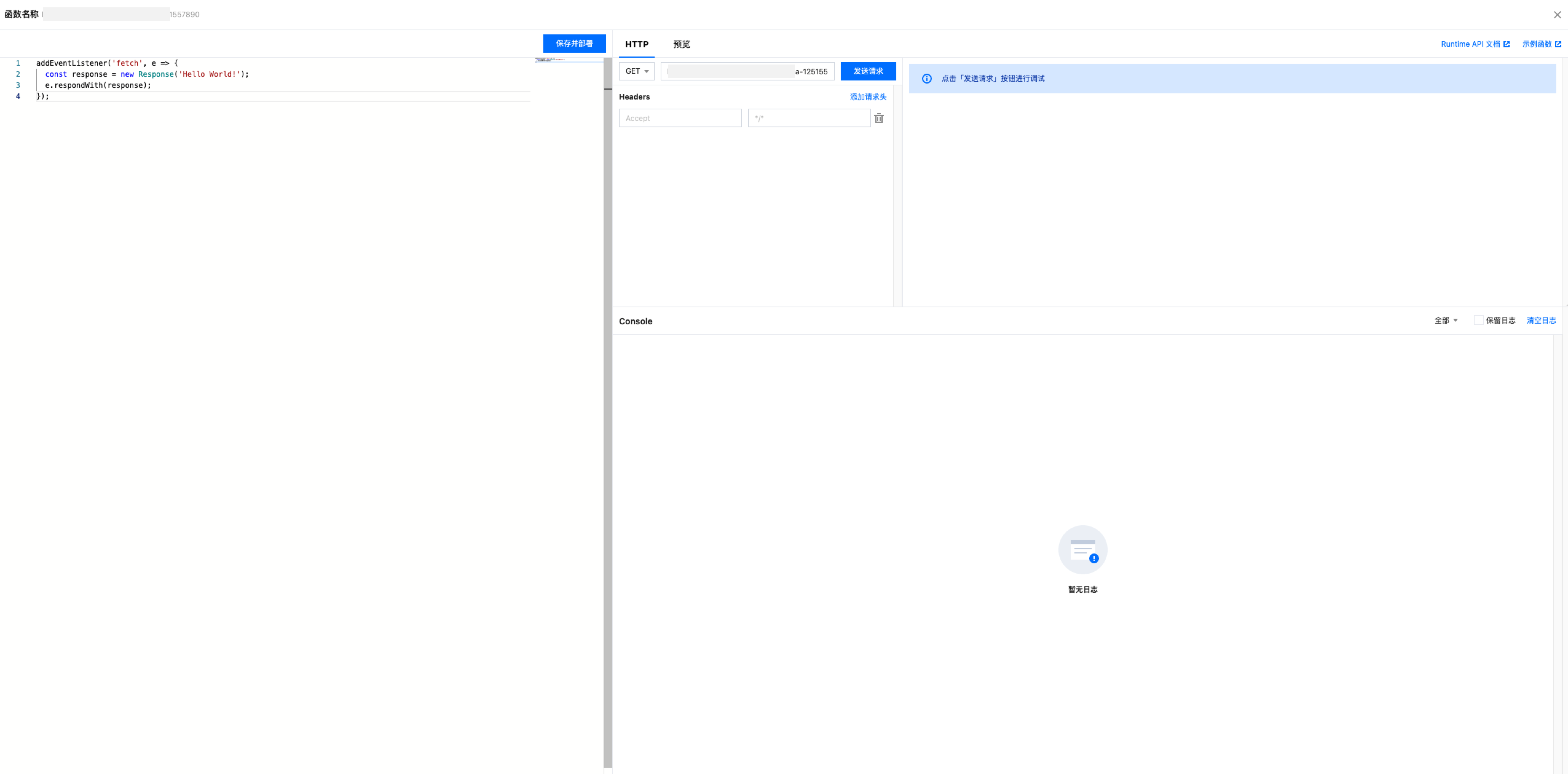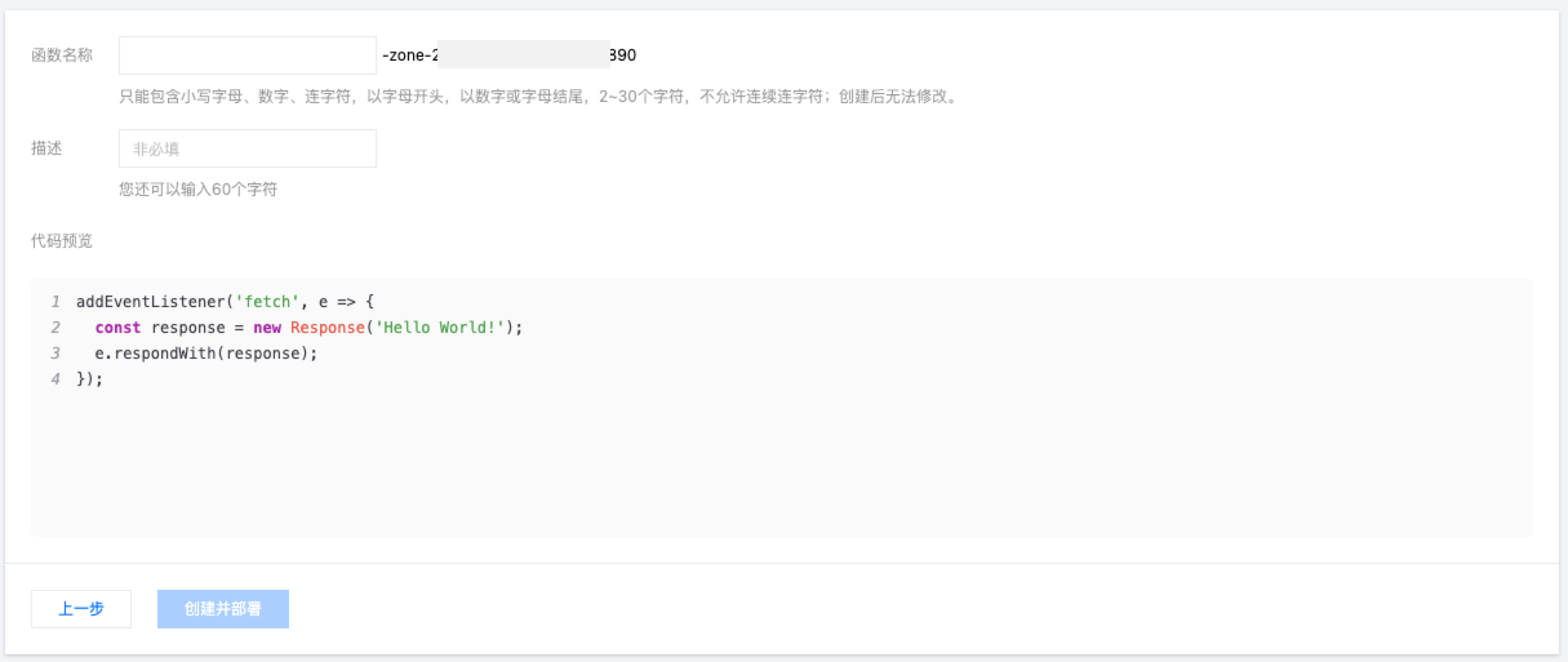 函数名称:必填项,只能包含字母、数字、连字符,以字母开头,以数字或字母结尾,2~30个字符;创建后无法修改。如:test-edgefunctions。