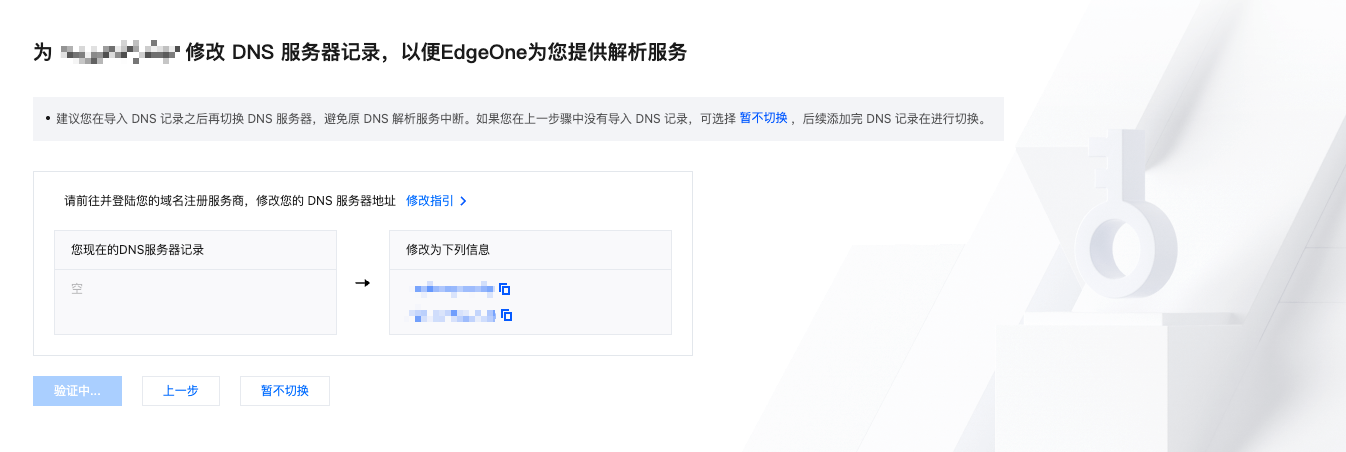 3. 单击下一步,在 NS 接入模式下,您需要前往原域名注册服务商,将域名的 DNS 服务器地址修改为 EdgeOne 所提供的 DNS 服务器地址,操作步骤可参考:修改 DNS 服务器。 4. 修改完成后,EdgeOne 将自动检测当前的 NS 服务器地址,当 NS 服务器已生效后,单击完成,即可完成站点添加。