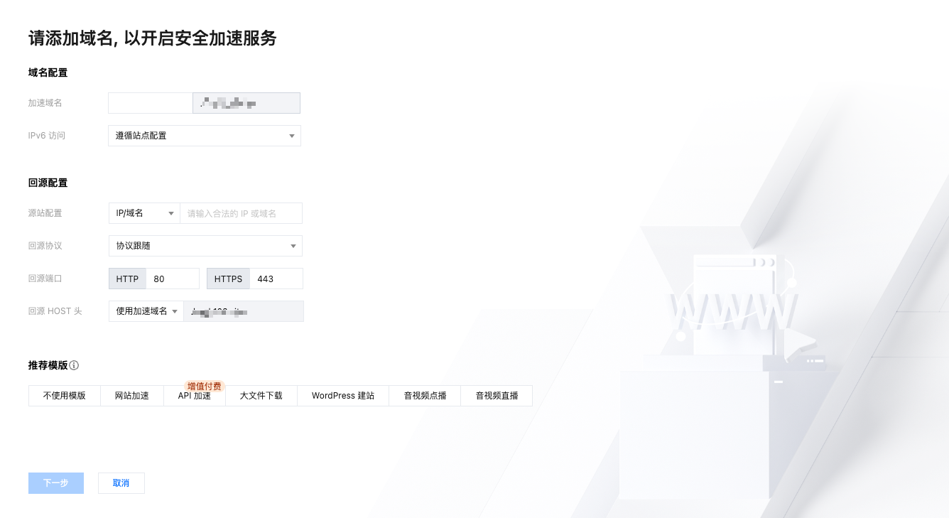 3. 填写需添加的加速域名以及对应的源站信息,配置完成后单击下一步。