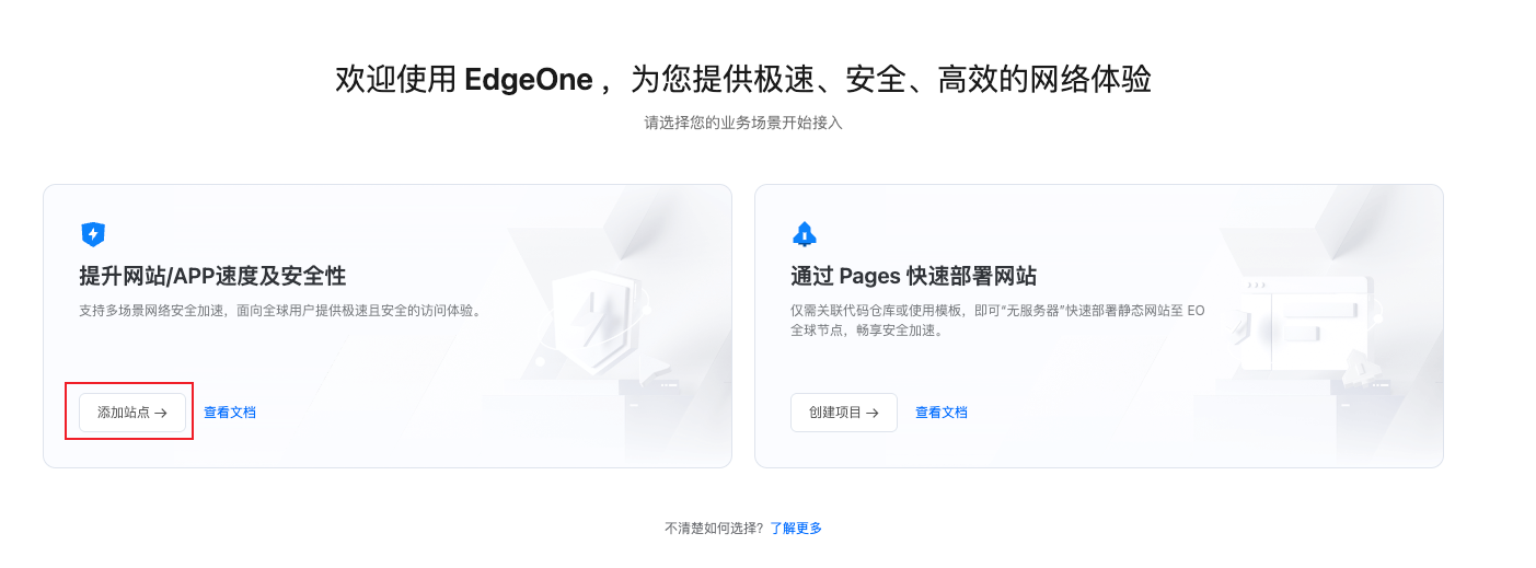 如果您是首次登录控制台,或者当前在 EdgeOne 内没有任何资源,则会进入场景选择大厅,在此界面内,点击添加站点。