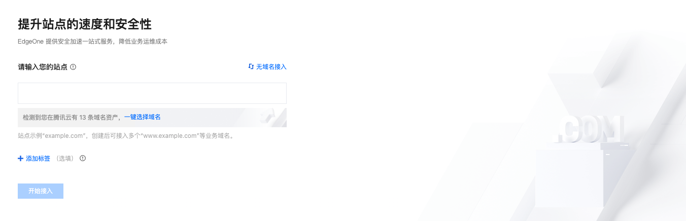 本文将引导您如何在 EdgeOne 上添加站点并开启安全加速的全流程,帮助您快速上手了解如何接入 EdgeOne 服务。