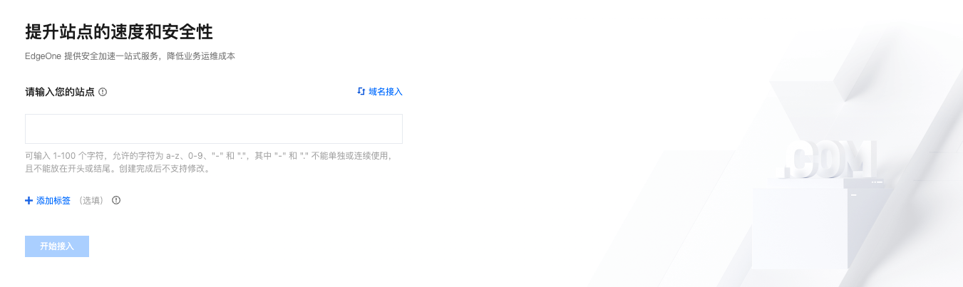 默认情况下,EdgeOne 接入要求您使用当前业务的二级域名作为站点名称接入,在站点输入框中,输入准备好的待接入站点域名,例如:example.com。单击开始接入。