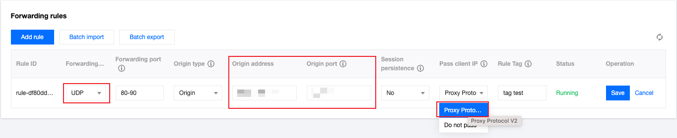 前往控制台内的四层代理服务,修改四层代理转发规则,填写对应的业务源站地址、源站端口,如果您当前的转发协议为 UDP,传递客户端 IP 选择为 Proxy Protocol V2。如果当前的转发协议为 TCP,则传递客户端真实 IP 选择为 Proxy Protocol V1/V2 均可。 步骤二:在业务服务器解析 Proxy Protocol 字段获取真实客户端 IP