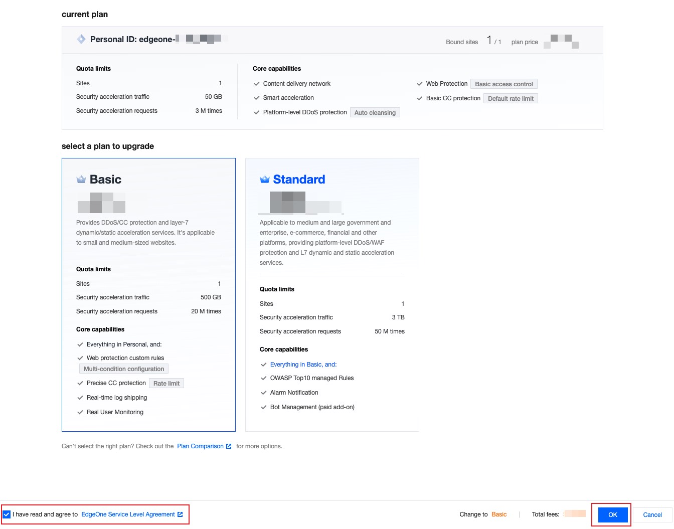 3. 在套餐变配页面,选择升级套餐,勾选同意服务协议,单击确定。