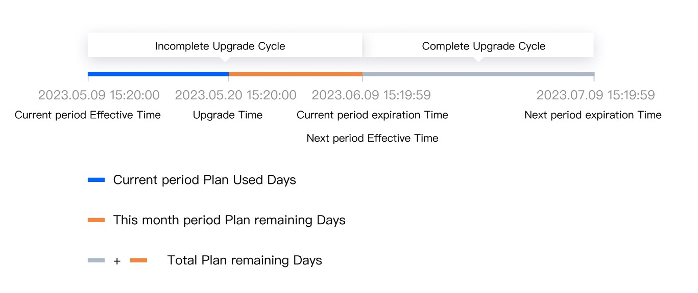 非完整周期:指当前套餐在当月剩余生效的有效周期,即当前生效的 2023年05月20日15:20:00 至 2023年06月09日 11:59:59 周期算做非完整周期。