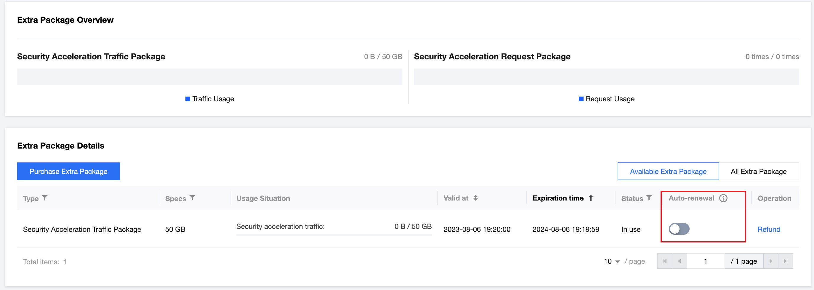 1. 在加量包管理页面,选择需自动续费的加量包,单击自动续费状态按钮,如下图所示: