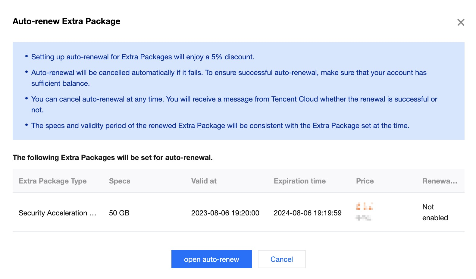 2. 在自动续费窗口,确认续费的加量包信息后,单击开启续费。