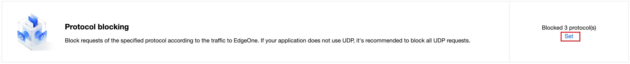 4. 在协议封禁卡片中,单击设置,进入协议封禁页面。