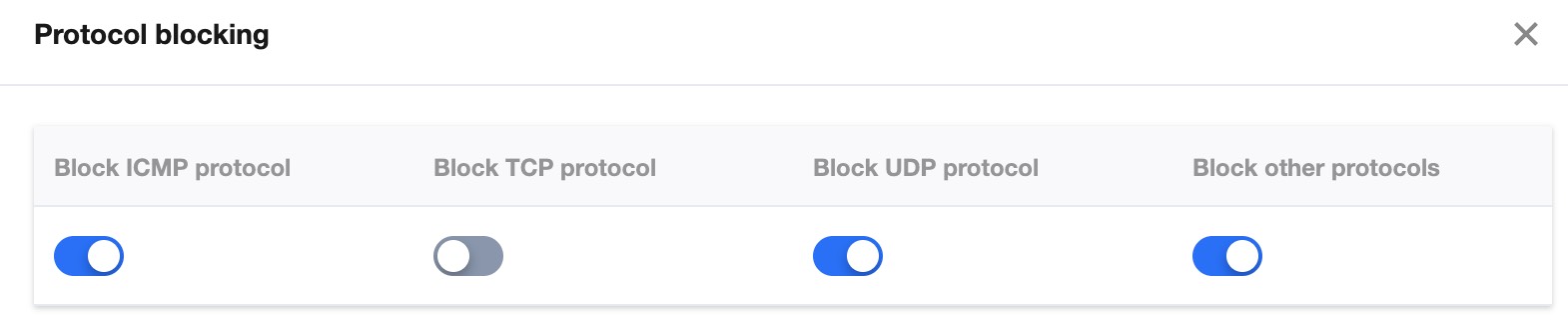 5. 在协议封禁页面,单击封禁所需协议开关,以当前场景为例,打开 ICMP 协议、UDP 协议封禁、其他协议封禁开关,开启后,规则将立即生效,对应的协议请求将被阻断。