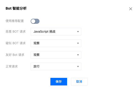 4. 配置各 Bot 分析标签的相应处置方式。以当前场景为例,可配置恶意 Bot 请求的处置方式JavaScript 挑战,疑似 Bot 请求和友好 Bot 请求保持为观察即可。