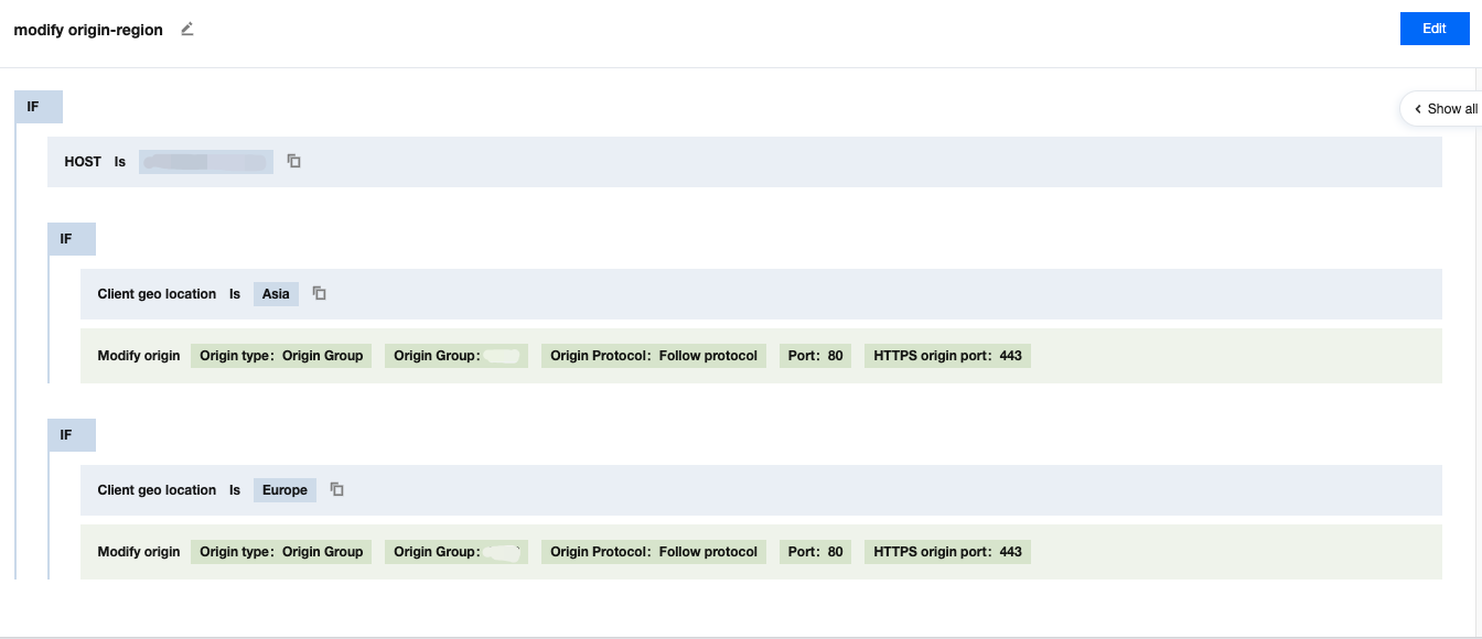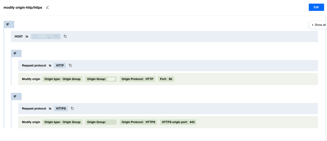 源站组内不再支持配置使用按地域/协议回源,如果您原来有配置相关的按地域/协议回源规则,该规则将迁移至规则引擎内,如下所示: