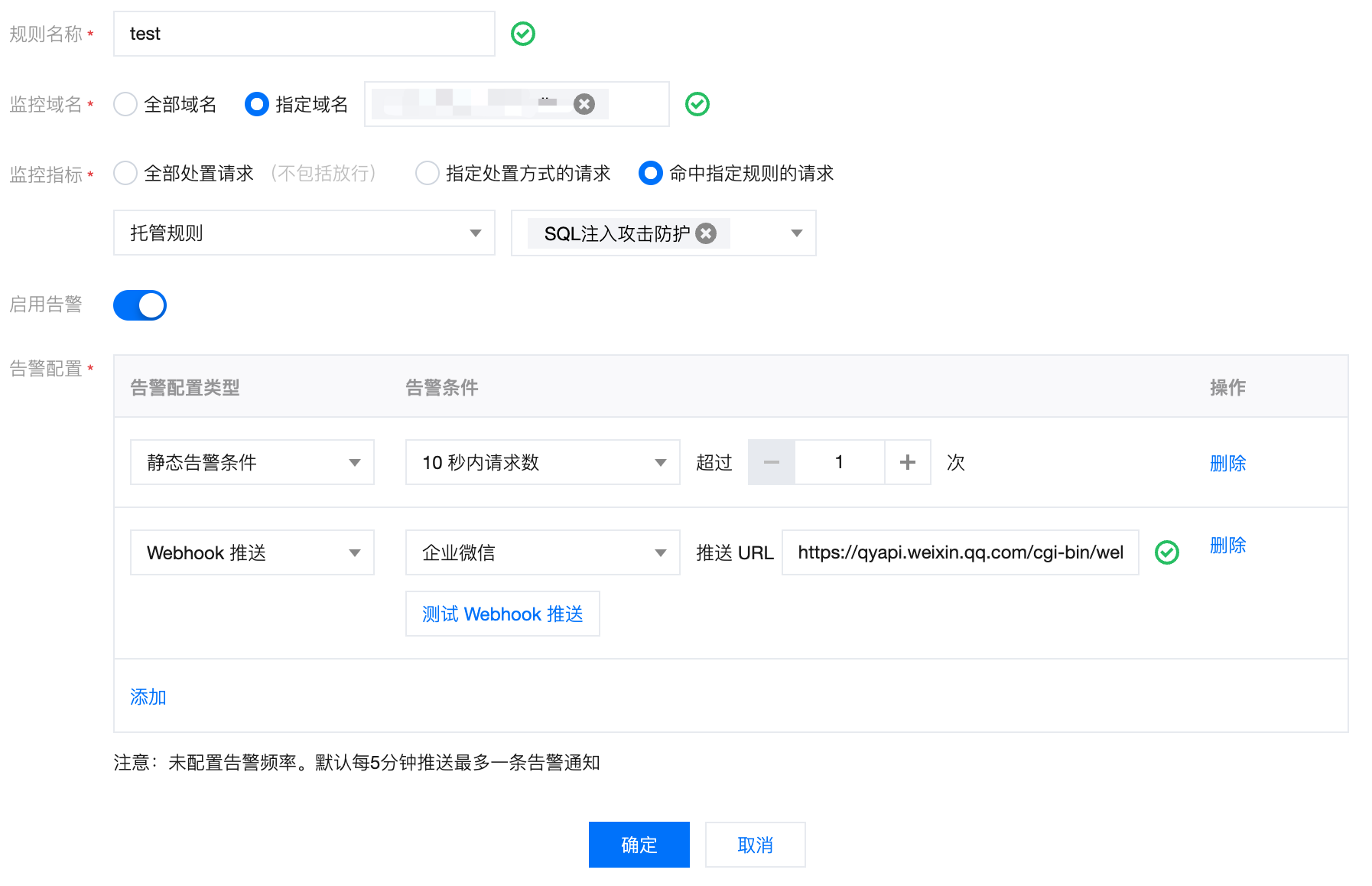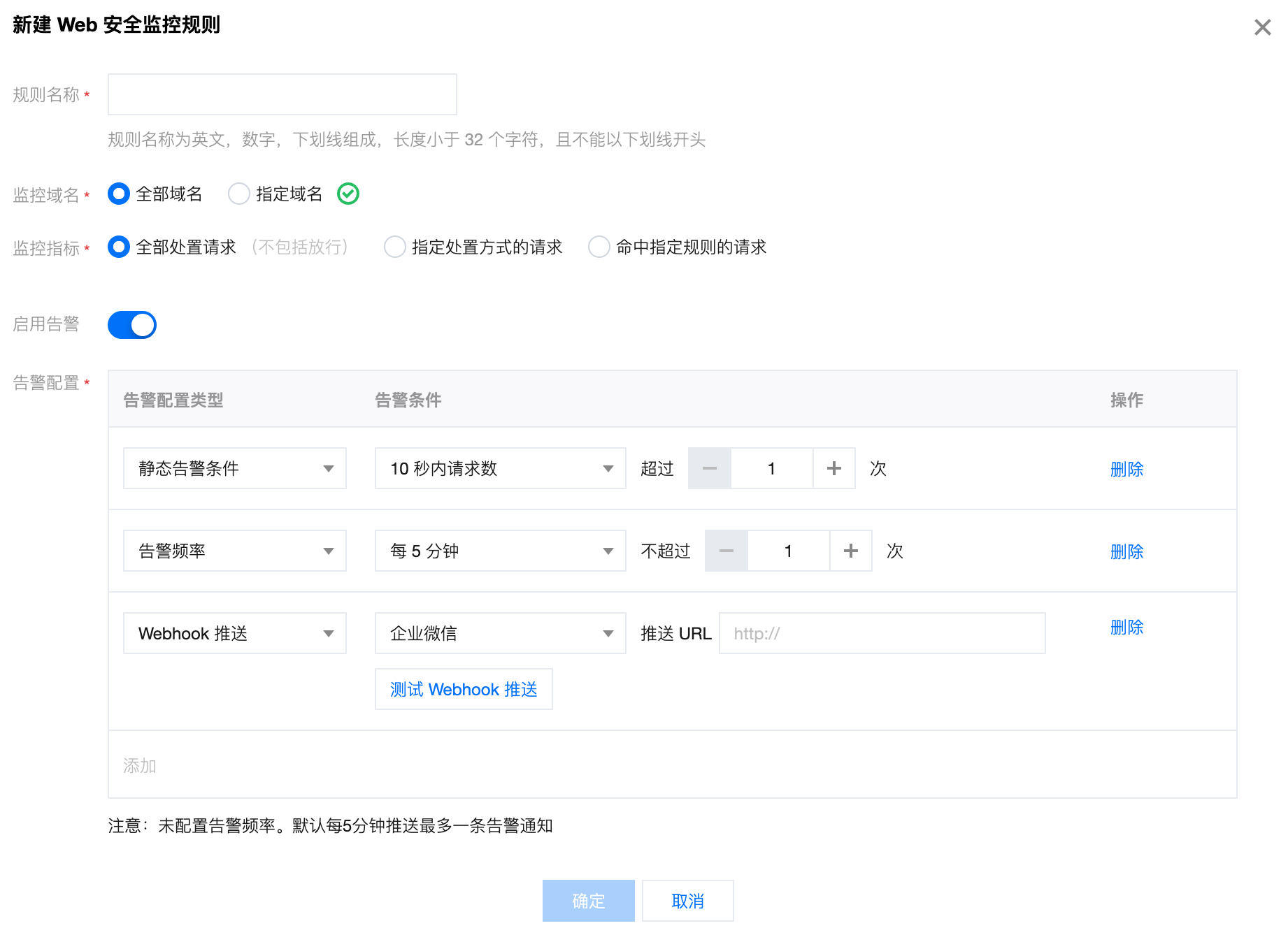 告警开关 | | 控制本条 Web 安全监控规则是否生效。 开启后,将通过消息中心提供的消息推送渠道(站内信/邮件/短信/微信/语音/企业微信服务号)进行告警,具体消息推送渠道可在 消息中心控制台 进行配置。 关闭后,本条 Web 安全监控规则将不再告警,包括消息中心相关渠道和 Webhook 推送。 说明 EdgeOne Web 安全监控告警消息对应消息中心的「安全事件通知」类型消息。 |