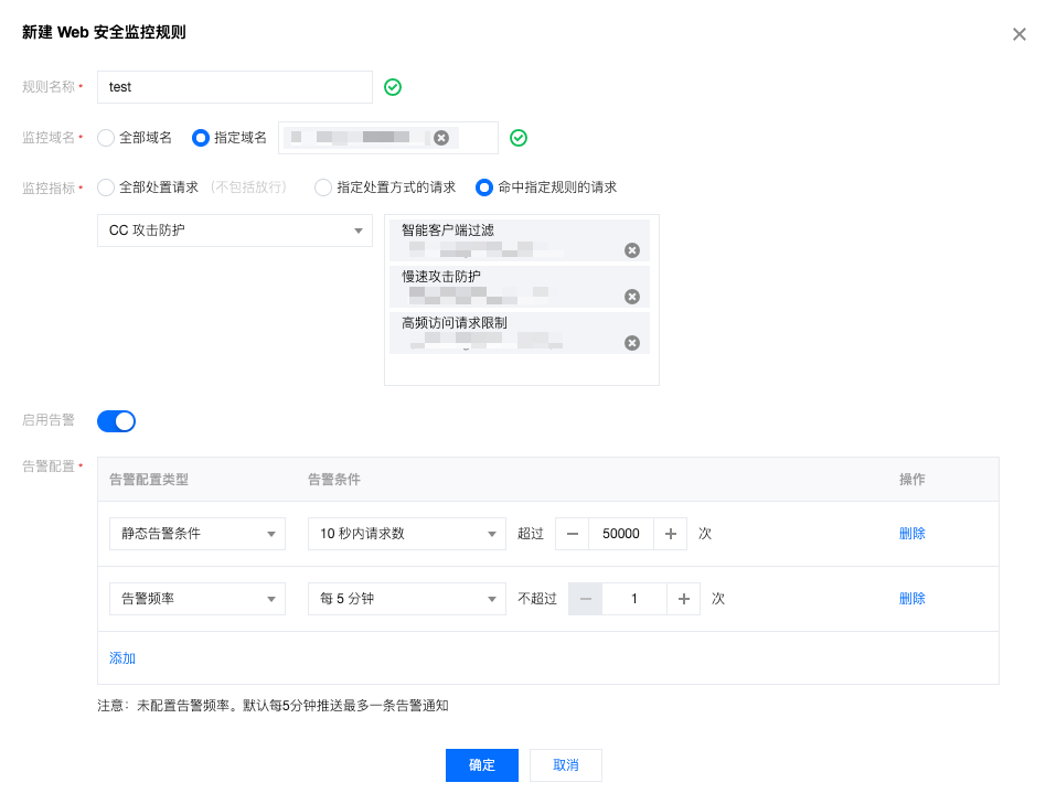 www.example.com被 CC 攻击时需要在 5 分钟内快速响应。因此对站点的 CC 攻击事件进行监控。当站点遭受超过 5000 QPS CC 攻击时,5 分钟内推送告警至其安全运维团队处理。www.example.com,监控指标为 CC 攻击防护中高频访问请求限制、智能客户端过滤和慢速攻击防护事件,当 10 秒内超出 50000 次 CC 攻击时,则立即触发告警并通过您在 消息中心控制台 配置的通知渠道发送告警消息。