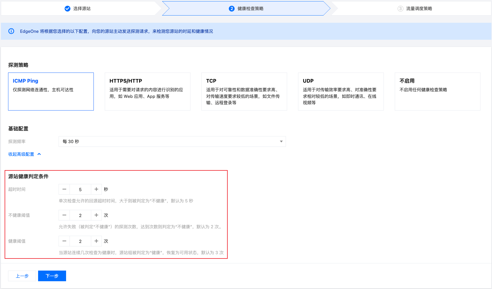不健康阈值 | 判断源站“不健康”所需要的探测次数,达到指定的次数则判定为“不健康”,默认为 2 次,可配置区间为 [1, 5]。例如:将该值设置为 2 ,当某个源站处于“健康”状态时,连续两次探测结果都是“不健康”,那么该源站就会被判定为“不健康”。 |