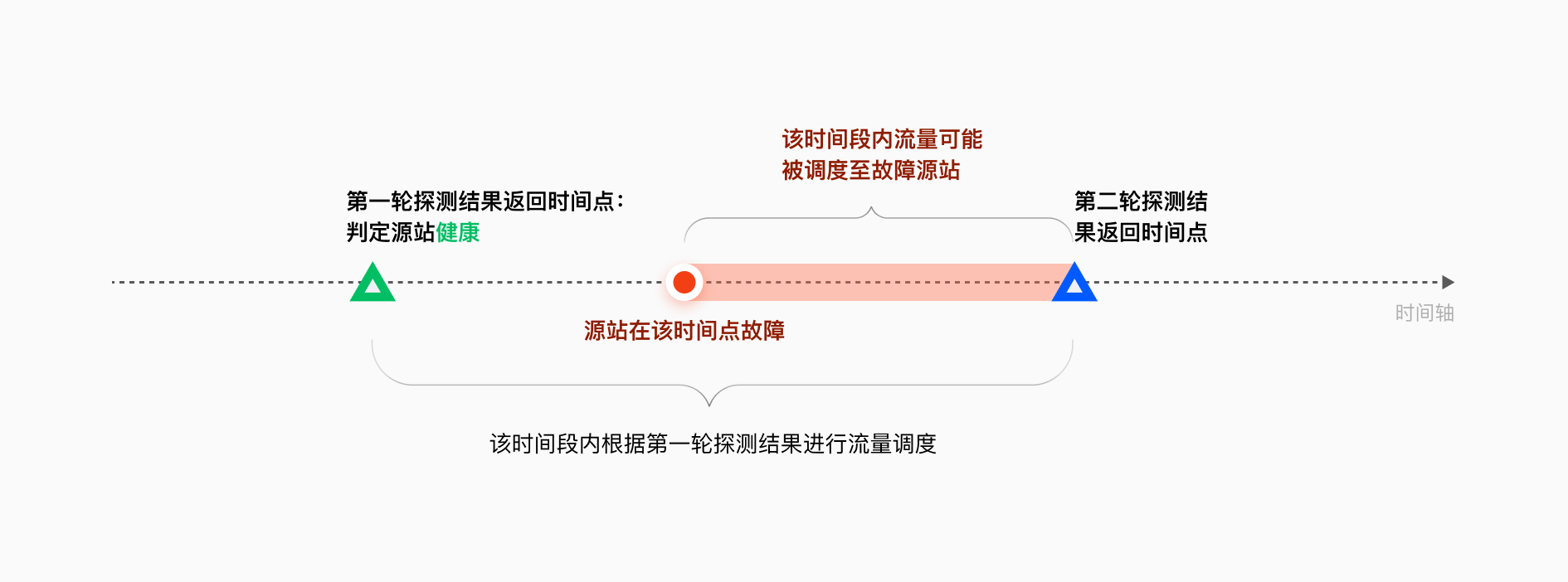 1. 源站故障后还未被主动探测屏蔽:配置了健康检查策略后,主动探测是周期性进行的,在新一轮探测结果返回之前,会根据上一轮探测结果进行流量分配。如果源站在两轮探测结果之间从健康变成了不健康,此时业务流量就可能仍然被调度至不健康源站,从而导致业务请求失败。