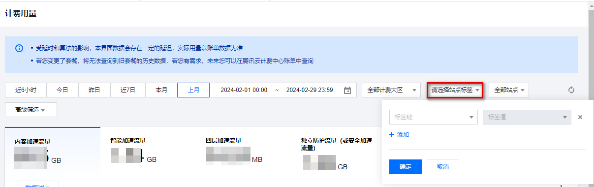 Project,标签值为具体项目名称;对于环境维度,设置标签键为Environment,标签值为Dev、Test或Prod等。根据规划的标签体系,公司通过 边缘安全加速平台 EO 控制台 或 API 为现有资源打上相应的标签。例如,某个站点属于“项目A”且处于开发环境,则为其打上Project:项目A和Environment:Dev的标签。当前结算周期结束并出账后,公司希望回顾上个结算周期按照标签维度的计费用量。