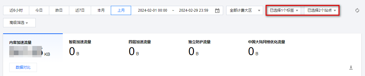 七层智能加速-流量 | 智能加速流量:所有域名在开启 智能加速 时产生的 L7(应用层)流量,统计上下行流量之和。 | |