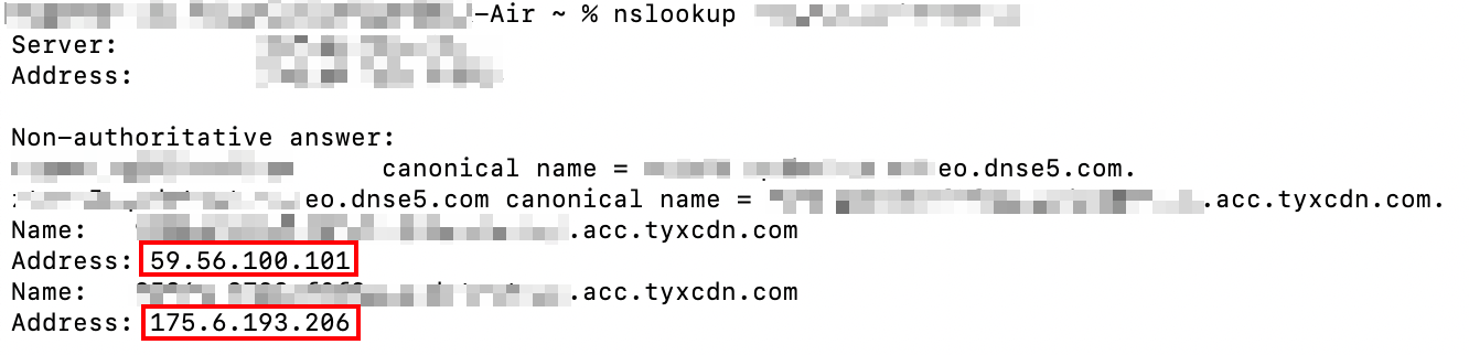 4. 通过命令行工具(CMD运行工具 或者终端),使用nslookup命令获取以上 CNAME 解析的边缘 IP,例如:nslookup www.example.com.eo.dnse5.com,获取到的 IP 如下所示,59.56.100.101 或者 175.6.193.206 均为 EdgeOne 边缘节点 IP。