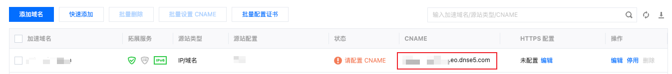 3. 在域名管理页面,如果您当前已完成添加域名,可以在该页面下看到 EdgeOne 为该域名分配的 CNAME 地址。