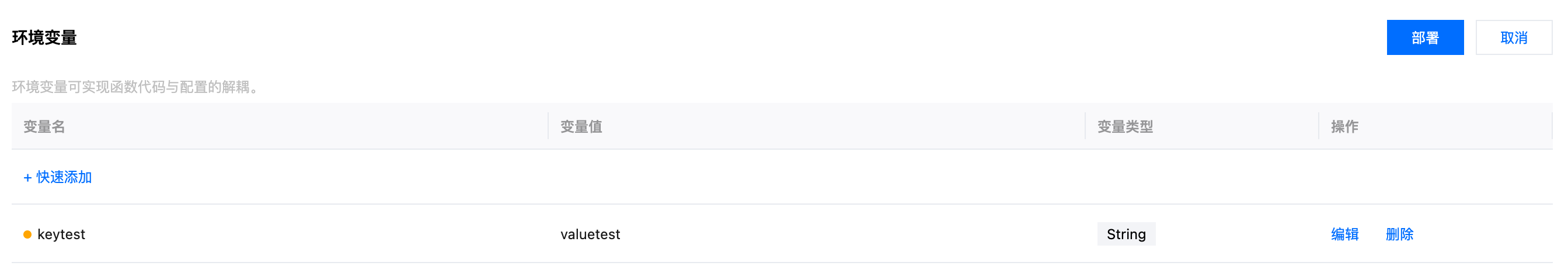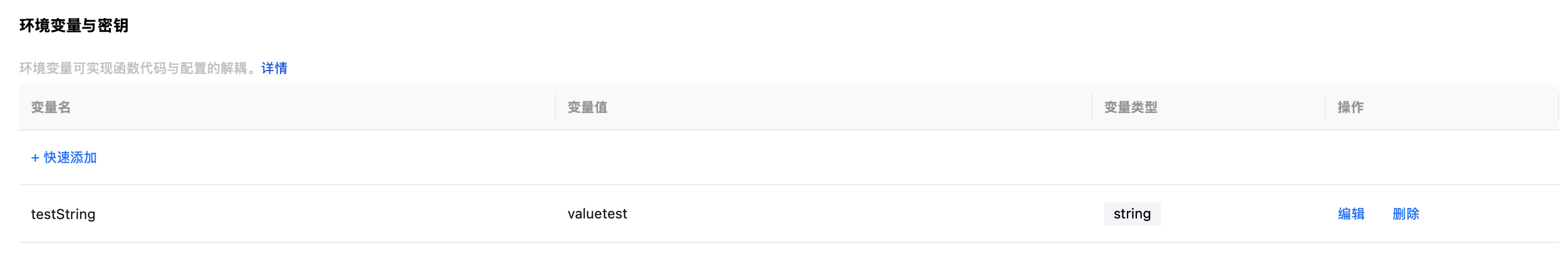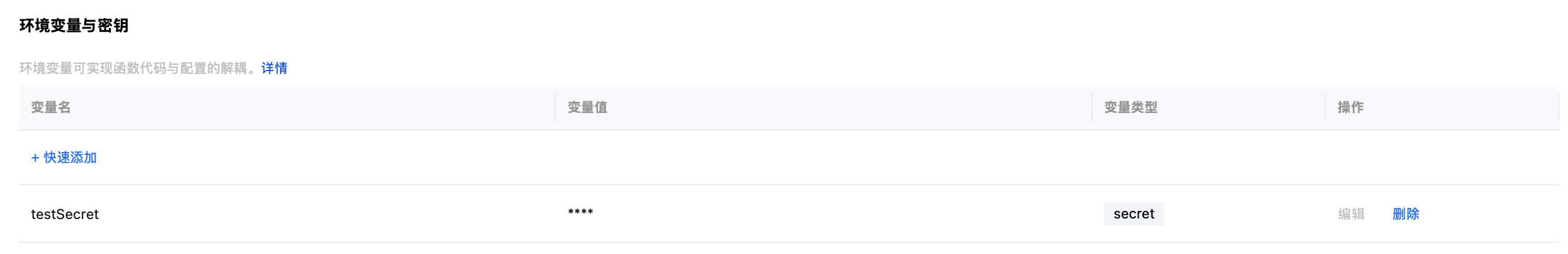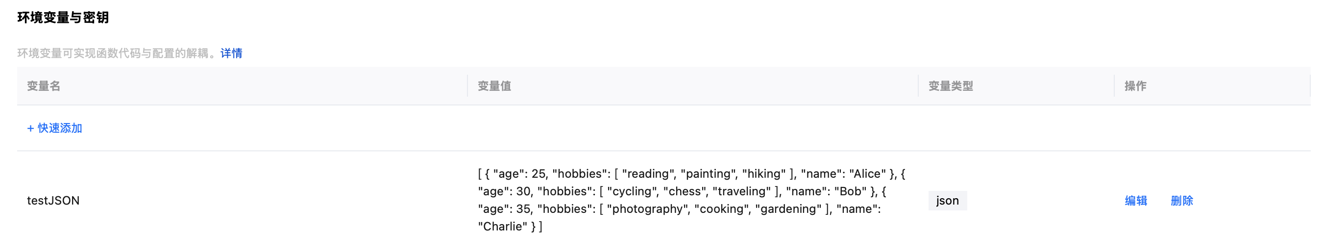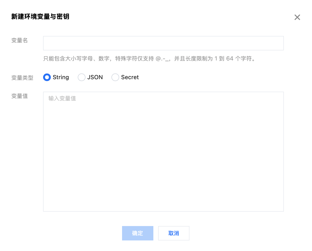 变量类型 | 必填项,支持 String 、 JSON 、Secret 三种类型的选择。 String:选择该项后,输入变量值的内容会以字符串的方式保存,具体使用请参考 边缘函数引用环境变量 的变量类型为 String 章节。 JSON:选择该项后,输入变量值的内容会以 JSON 数组方式保存,边缘函数会自动把该变量值解析为 JavaScript 对象,无需手动调用 JSON.parse() 处理,具体使用请参考 边缘函数引用环境变量 的变量类型为 JSON 章节。 Secret:选择该项后,输入变量的内容支持以 JSON 数组或字符串的方式保存,保存后变量值将不再可见,请妥善保管。具体使用请参考 边缘函数引用环境变量 的变量类型为 Secret 章节。 |