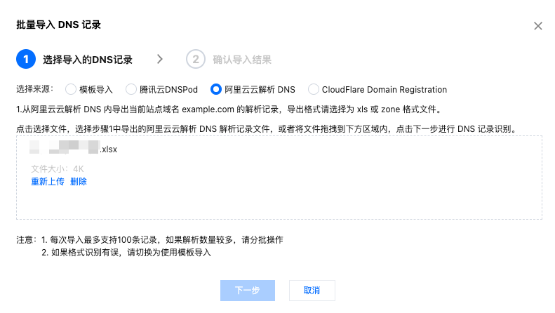 3. 选择导入来源,以该场景为例,选择导入来源为阿里云云解析 DNS。选择文件为阿里云云解析 DNS 导出的 DNS 记录文件,导出方式请参考对应厂商的产品文档指引。