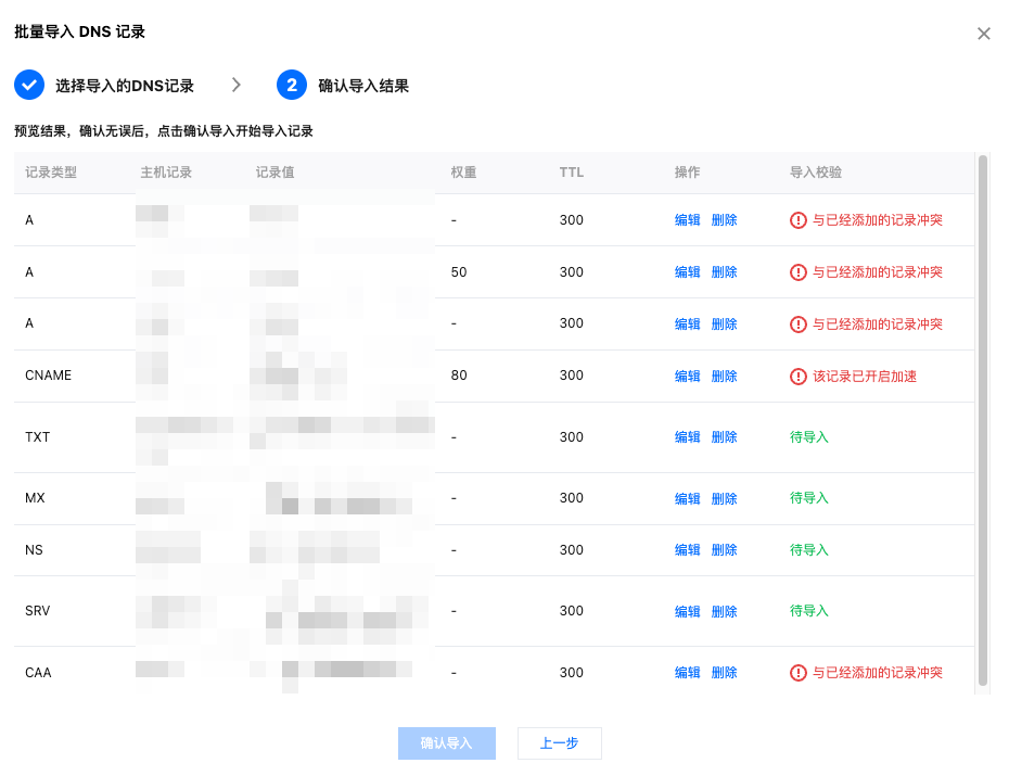 5. 单击下一步,识别模板内容,如果文件格式校验无误,则需要再次确认需导入的 DNS 记录内容,如果 DNS 记录内容有误,可以在该界面内进行修改。