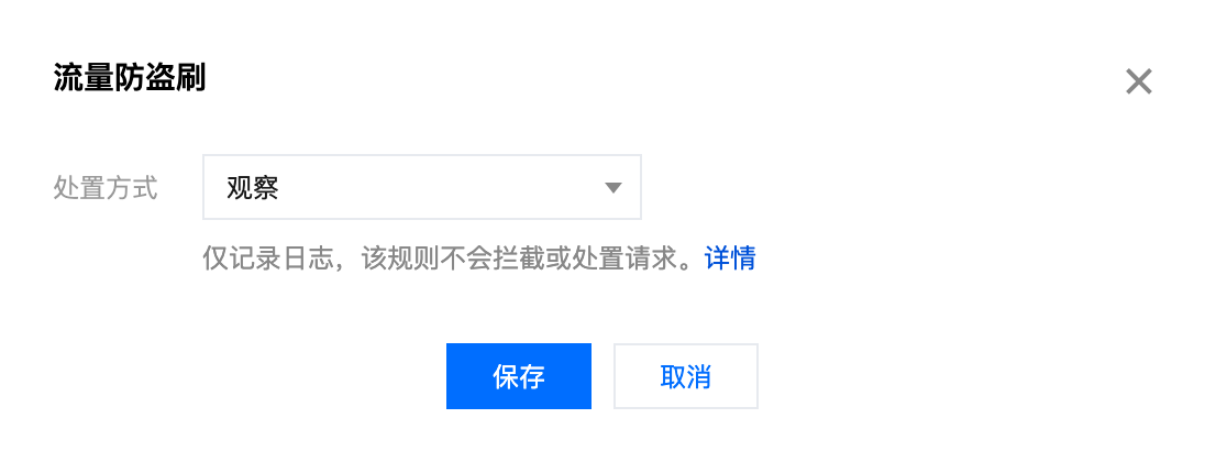流量防盗刷支持观察、拦截、JavaScript 挑战处置方式,请根据业务兼容性配置合适的选项。详情请见处置方式。 说明: