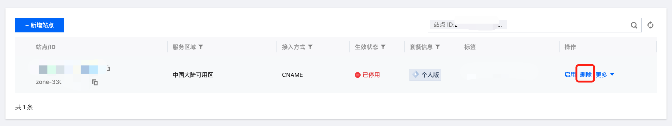 2. 站点进入停用状态后,单击删除,在弹出的二次确认窗口中确认删除。