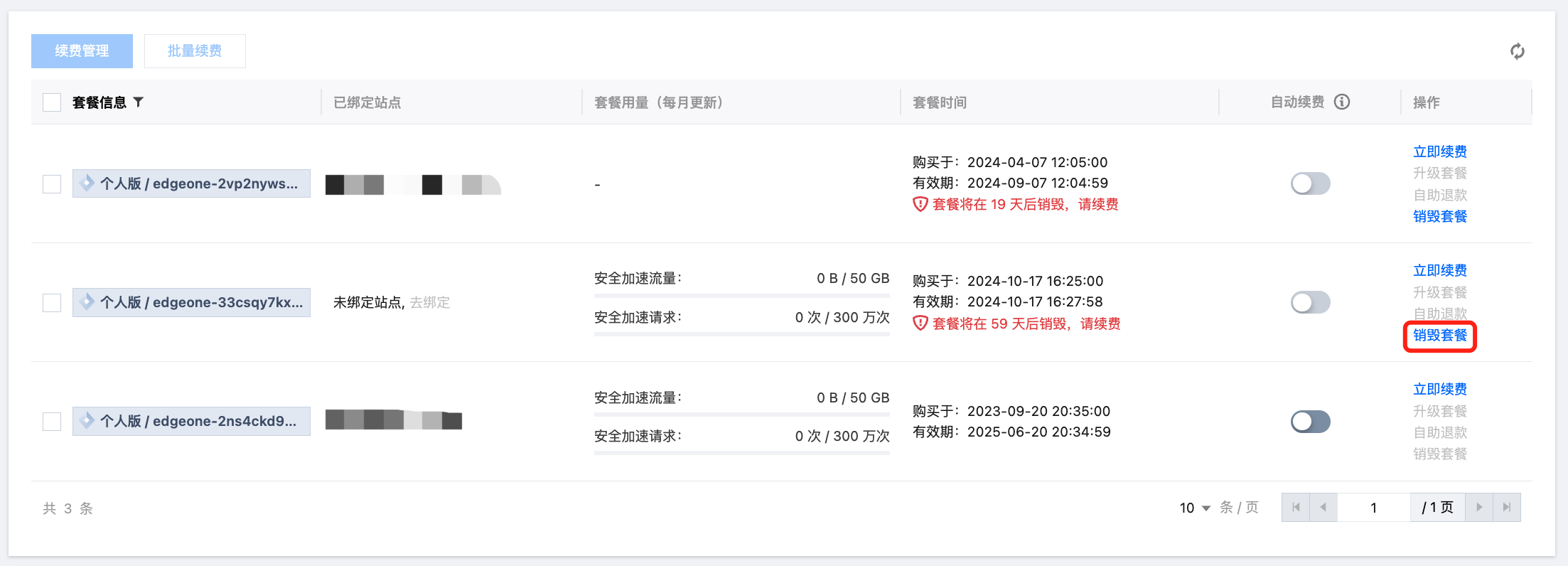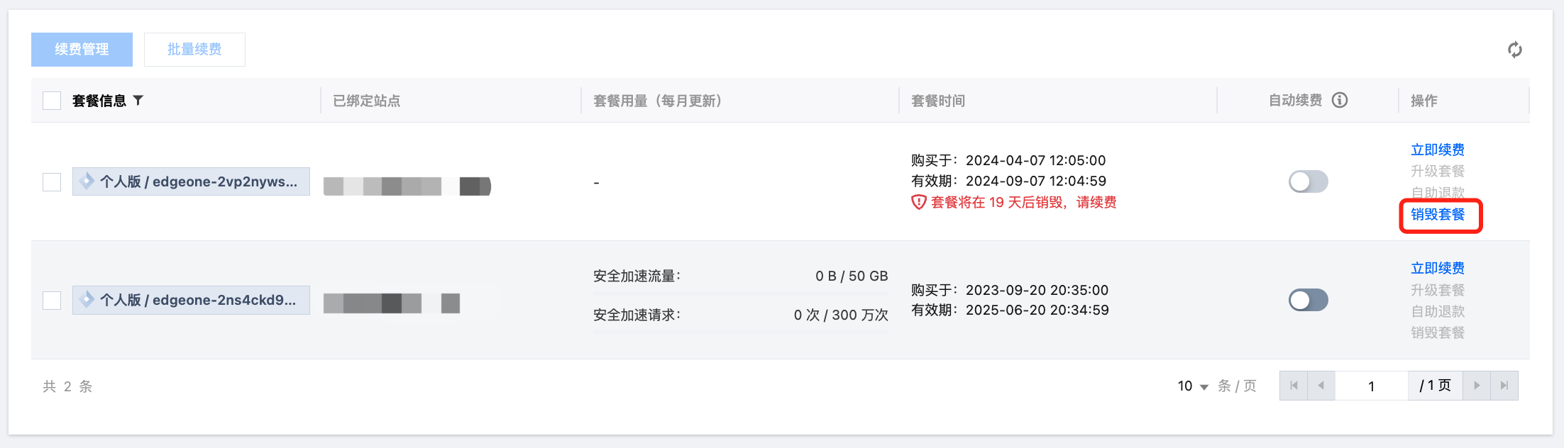 当您不再需要边缘安全加速平台 EdgeOne 服务时,可以对边缘安全加速平台 EdgeOne 套餐进行销毁。套餐一旦变为销毁状态时,就不再产生与边缘安全加速平台 EdgeOne 相关的费用。销毁套餐包含以下 2 种方式: