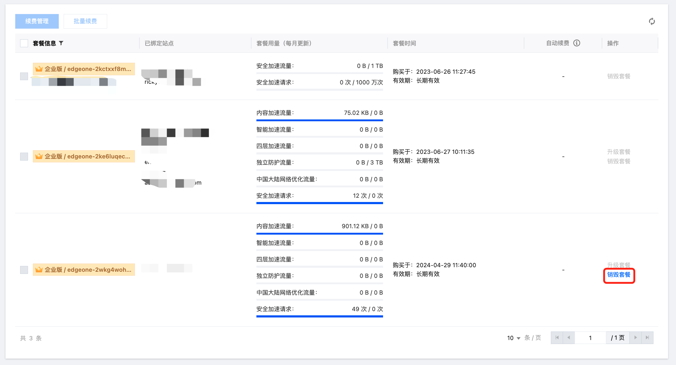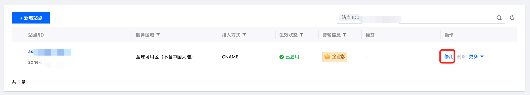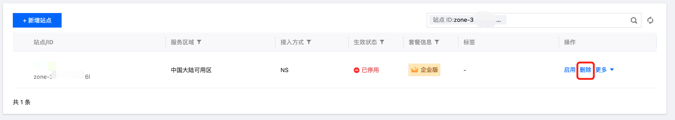 3. 按步骤 1 和步骤 2 逐一地将企业版套餐下的所有站点都停用并删除后,企业版套餐将自动进行销毁。