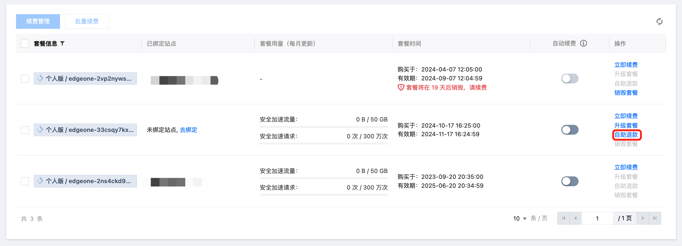 3.1 套餐若处于生效状态,且满足退款规则,可以先单击自助退款,退款完成后再进行销毁套餐。