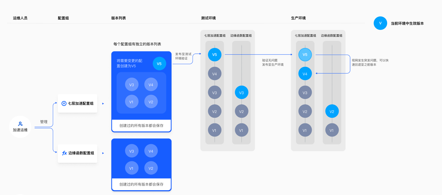 当前版本管理仅支持七层加速配置组和边缘函数配置组,即开启版本管理之后,站点加速、规则引擎和边缘函数模块会处于版本管理模式仅能跟随版本变更,站点下其他配置都处于即时生效模式。