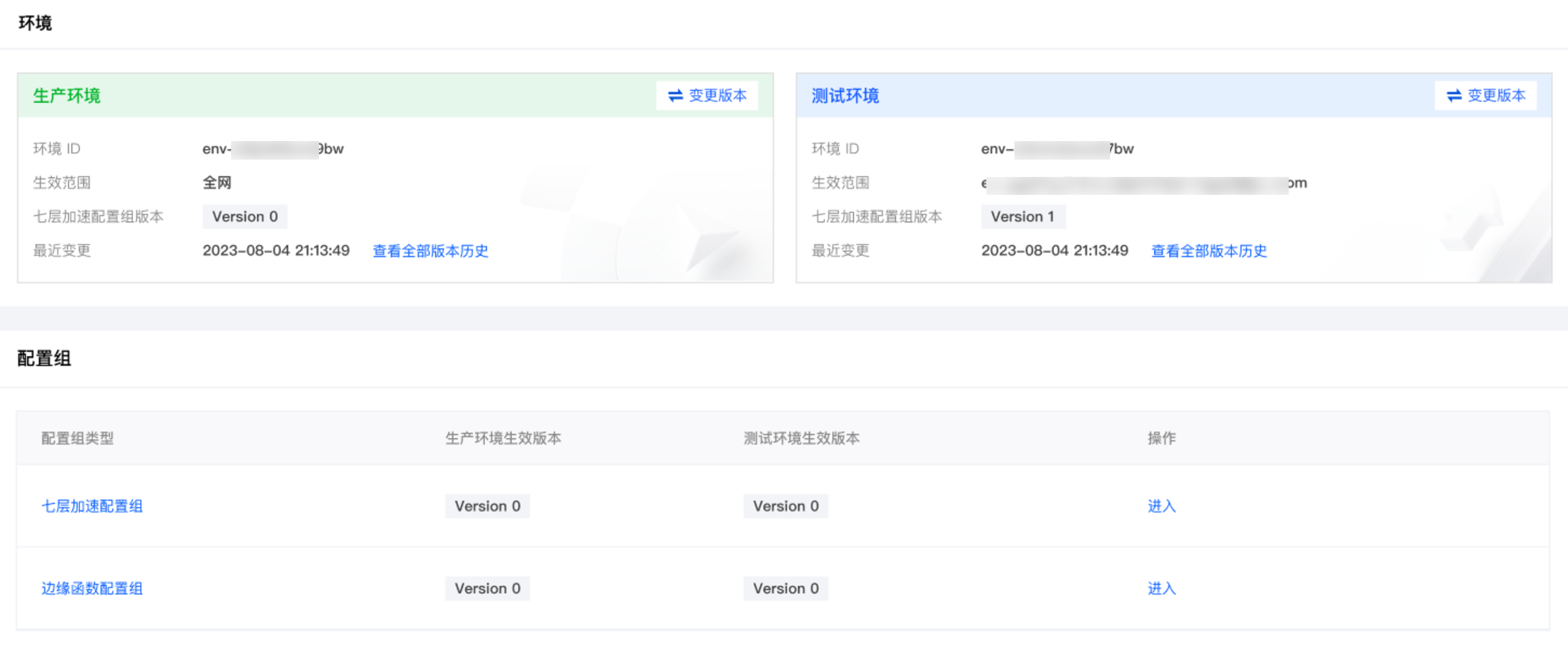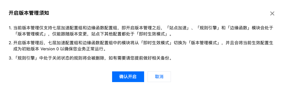 1. 开启版本管理后,七层加速配置组和边缘函数配置组中的模块将从即时生效模式切换为版本管理模式,并且会将当前生效配置生成为初始版本 Version 0 以确保您业务正常运行。