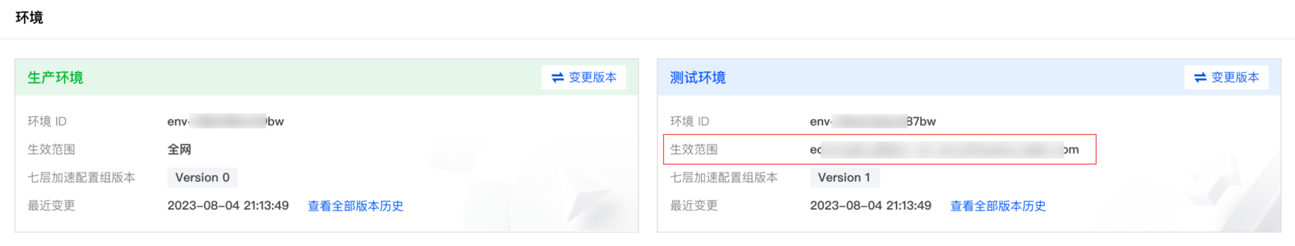 1. 单击顶部导航的版本管理回到环境页,在测试环境页上会显示测试环境生效的 CNAME 地址,您可以获取该 CNAME 的访问 IP 绑定,修改 HOST 文件来绑定该 IP 进行模拟访问测试。
