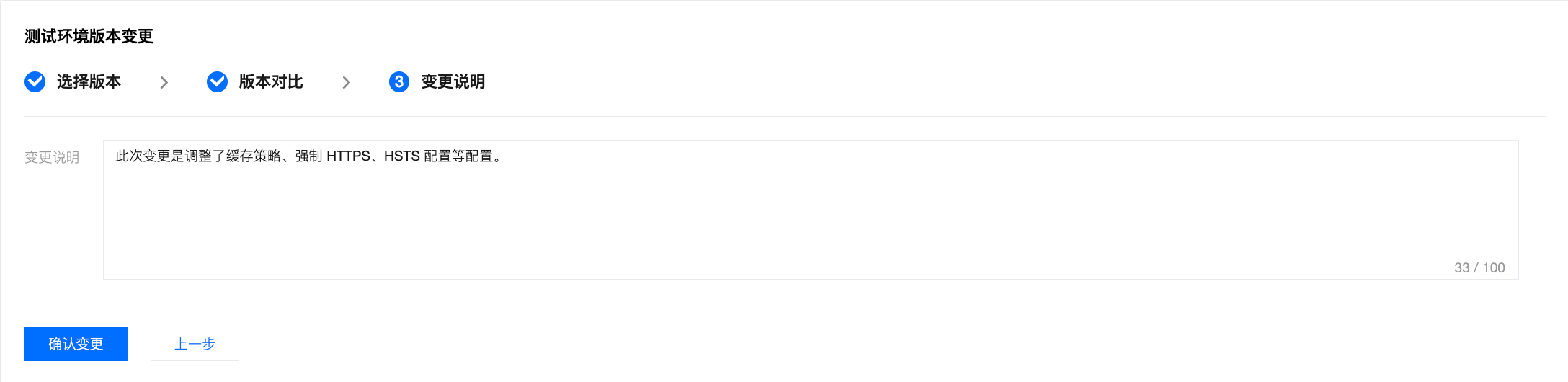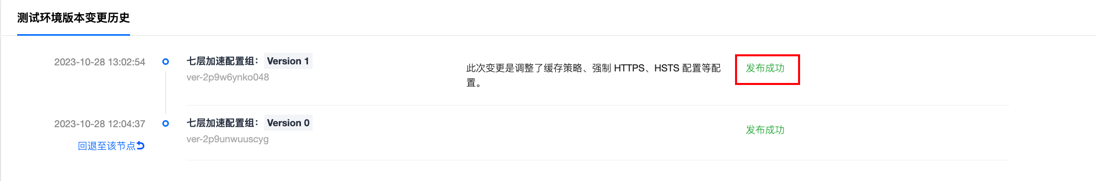 6. 您需要填写变更说明,限制100个字符长度以内。完成填写后,单击确认变更。 7. 在测试环境版本变更历史页中,看到发布成功则表示 Version 1 的配置已经在测试环境中生效了。 步骤2:进行模拟访问测试