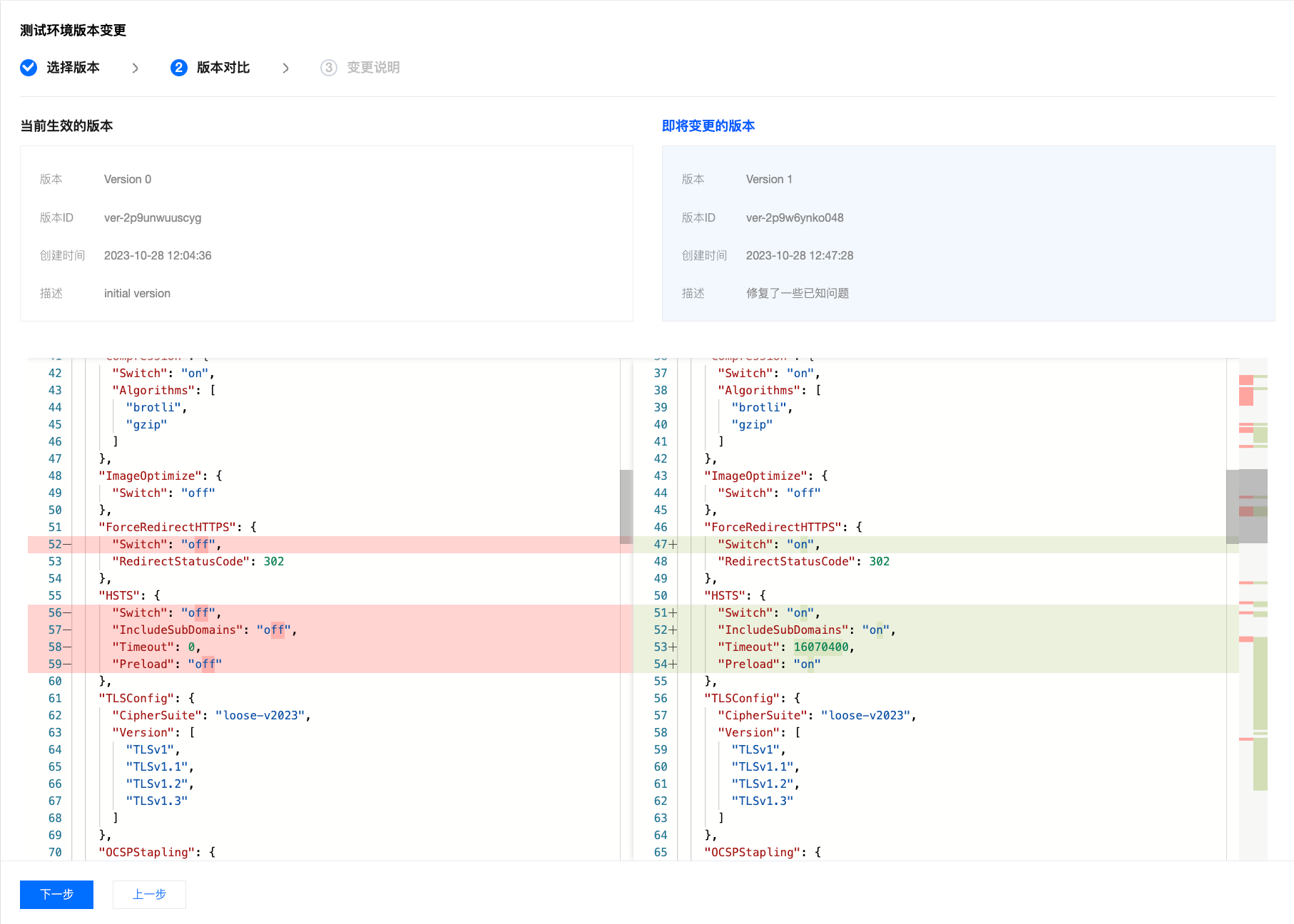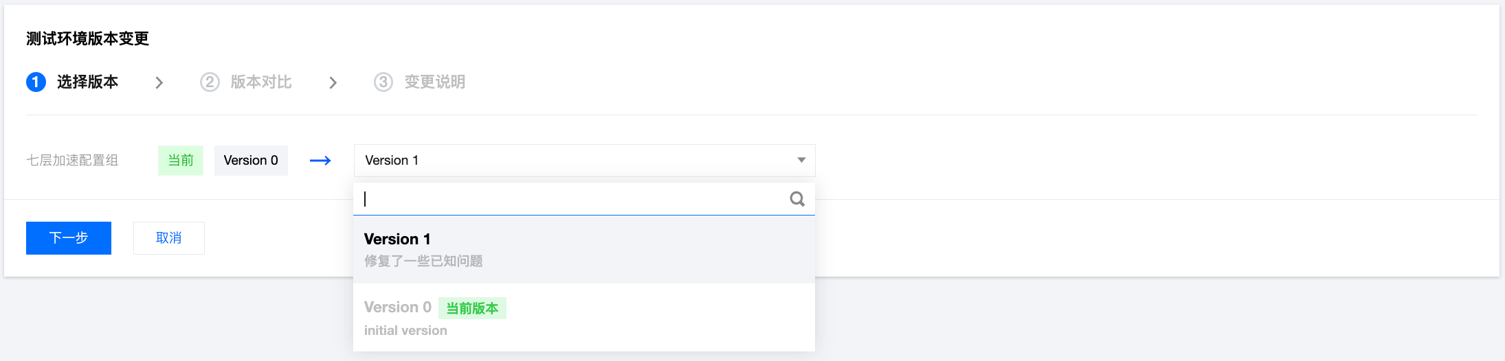 4. 请您选择需要变更的 Version 1,单击下一步。 5. 您可以在版本对比页查看新版本与原版本的差别,确认下变更的配置是否符合预期,确认无误后,单击下一步。